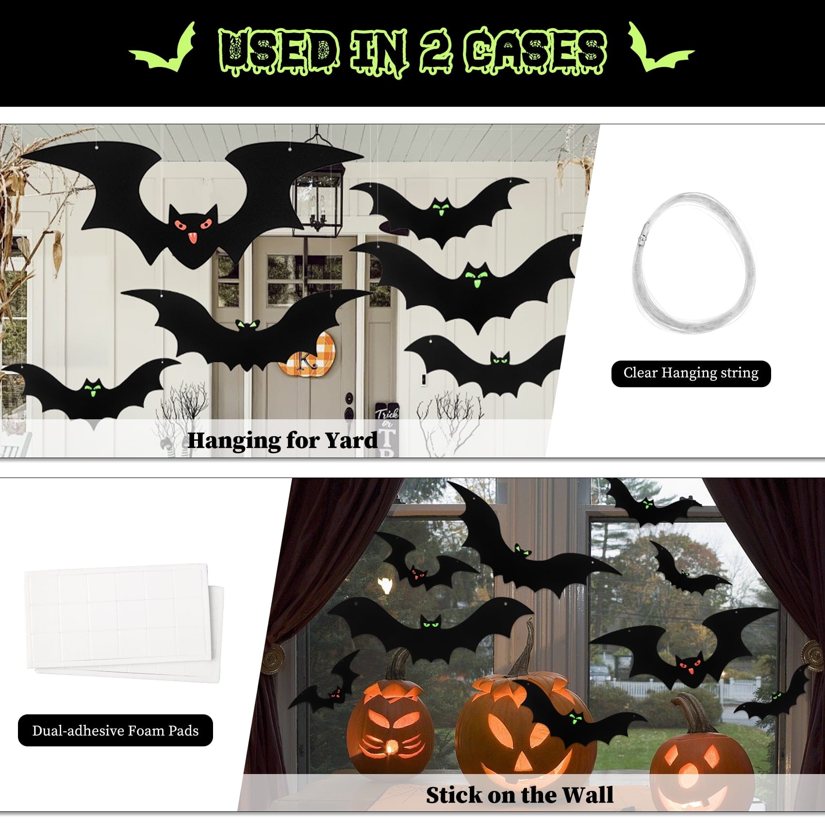 Zsiparty 24 Pack Hanging Bats Halloween Decorations Outdoor, Waterproof Black Plastic Bats 3 Different Sizes with Glowing Eyes Stickers, Bat Decorations Perfect for Halloween Hanging Tree Decor