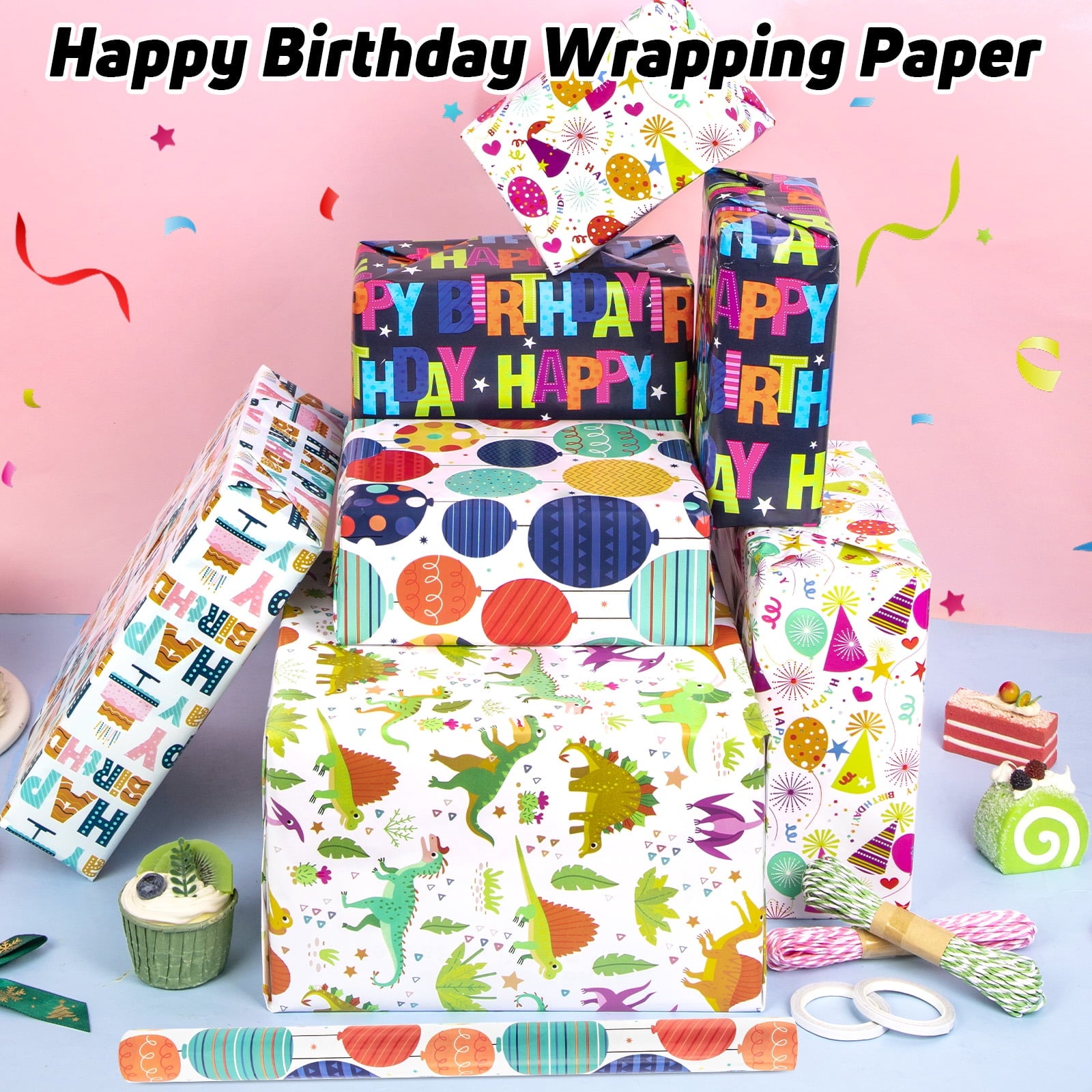 Zsiparty Birthday Wrapping Paper Rolls, 5 Rolls Gift Wrapping Supplies with Happy Birthday, Balloons, Cake, Dinosaur, Hat Pattern Design, 17 x 120 inches