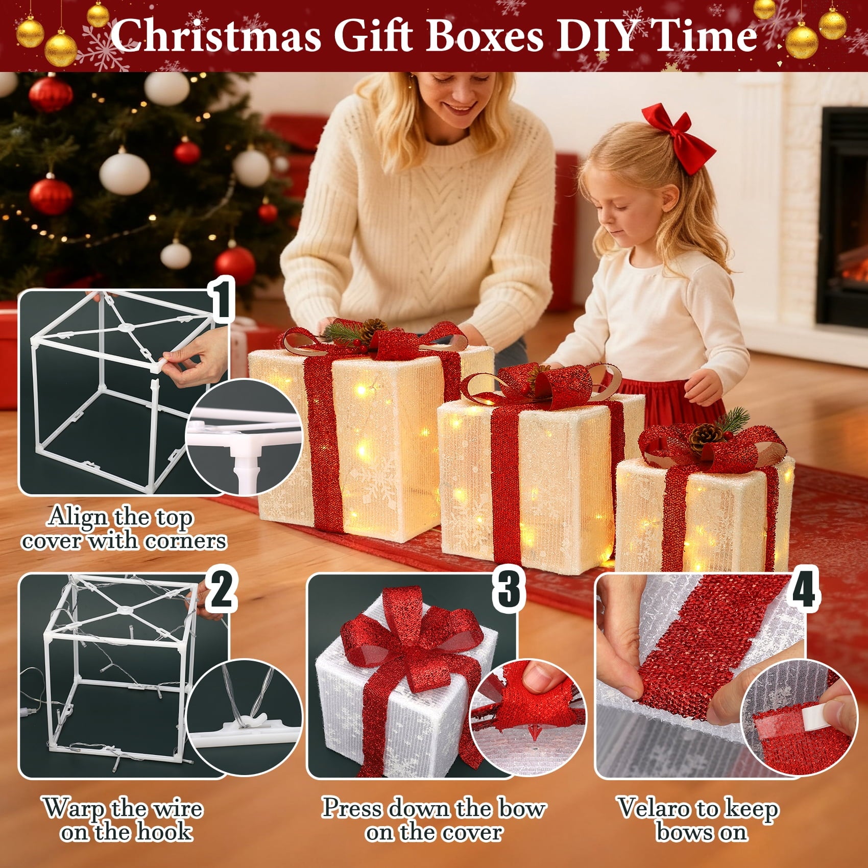 - 3 Different Sizes: Our Christmas lighted gift boxes come in three different sizes, big box sized10.2 inches, medium box sized 8.3 inches and small box sized 6.3 inches.You can arrange the boxes however you like, all Christmas lighted gift boxes fixed tightly and firmly by bow ties, durable and no worrying on loosening or dropping off, better storage for reusing next year.